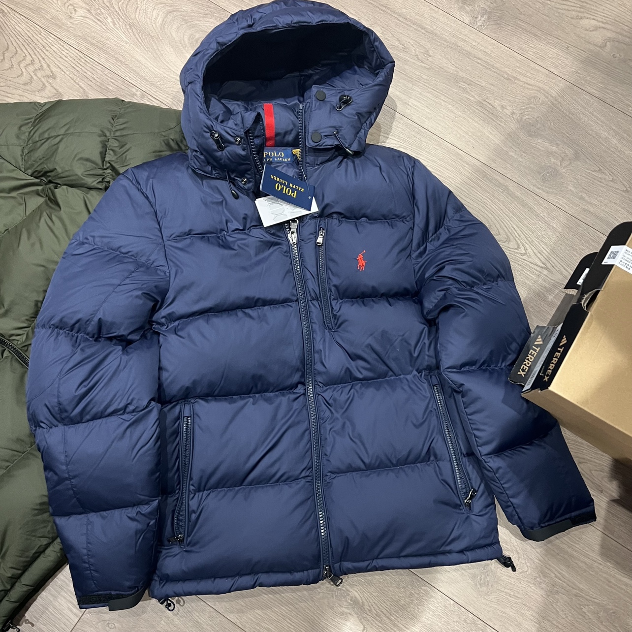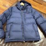 Navy Blue Hooded Down Jacket – Thick Warm Winter Waterproof Jacket with Brand Red Logo, Suitable for Men’s Daily and Leisure Use
