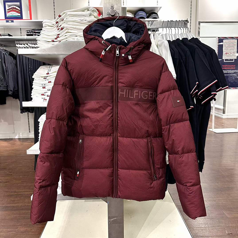 Men’s hooded down jacket – orange quilted jacket, fashionable embroidered warm winter outfit, with adjustable hood